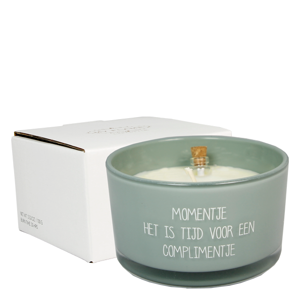 Op de geurkaars staat 'Momentje. Het is tijd voor een complimentje'.