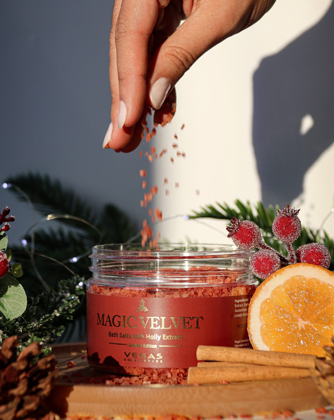 Ons Magic Velvet badzout tovert elke badsessie om tot een heerlijk feestelijk wellnessritueel. Verrijkt met hulst-extract, zuiver zeezout en een verfijnde mix van essentiële oliën, omhult de warme geur van kaneel, sinaasappel, citrus en winterse kruiden je zintuigen. Het ontspant je spieren, verzacht je hoofd en brengt meteen dat fijne kerstgevoel je badkamer binnen. 🎄💫